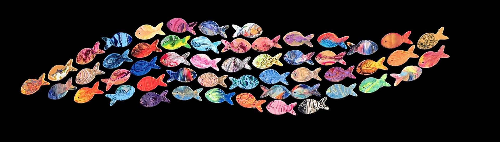 Mein Bild zeigt einen dynamischen Schwarm aus Fischen, jeder einzelne ein Unikat aus verschiedenen acrylic pouring Techniken.